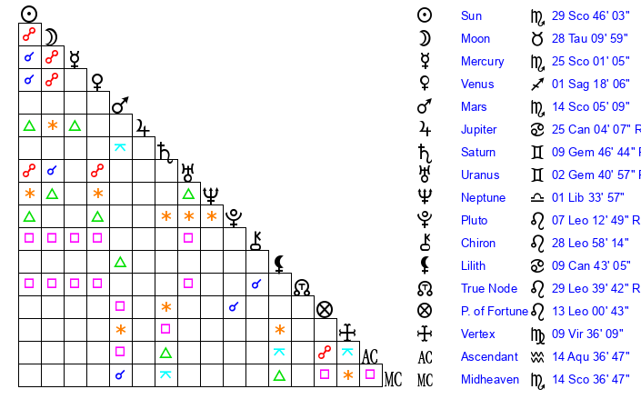 | Moon | 28 Taurus 6 | 27 Sagittarius 9 | 12 Gemini 56 |