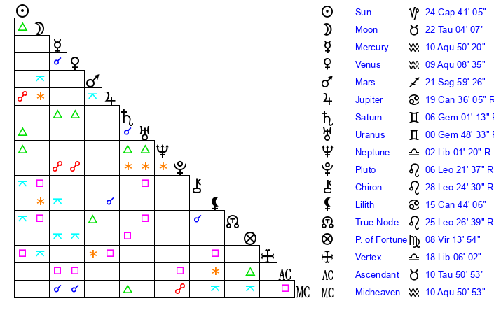 | Sun | 24 Capricorn 41 | 25 Capricorn 48 | 17 Aries 0 |