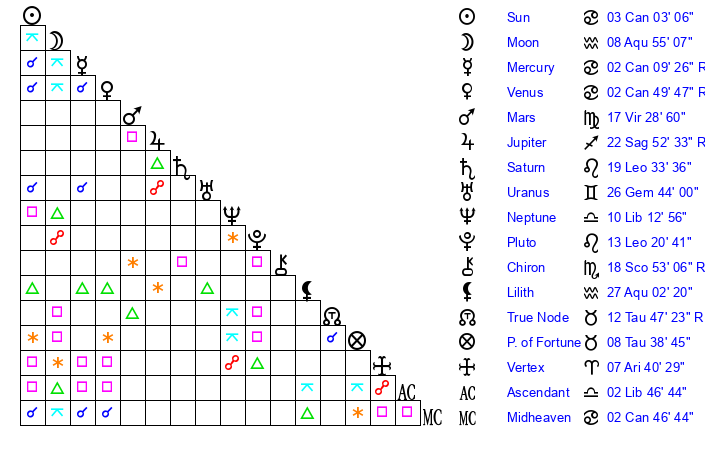| Pluto | 13 Leo 20 | 3 Aquarius 15 | 15 Leo 32 |