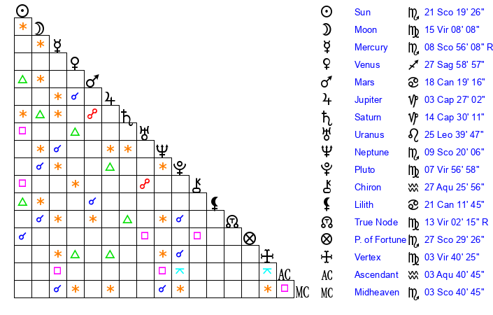 | Moon | 15 Virgo 7 | 9 Virgo 1 | 8 Aquarius 51 |