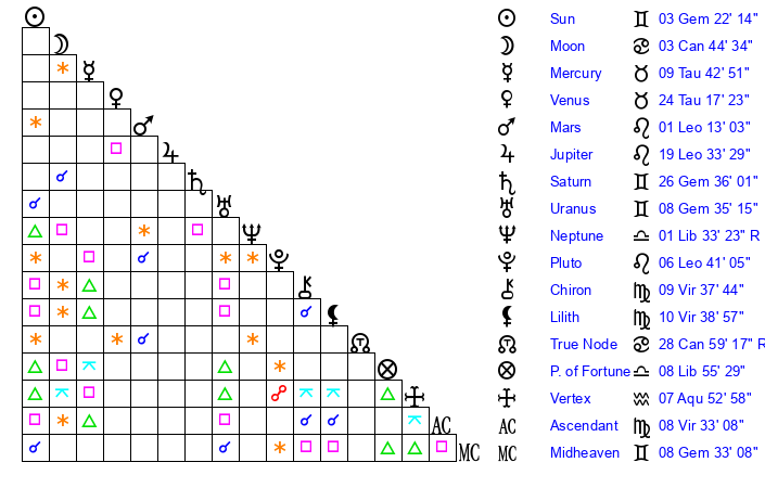 | Sun | 3 Gemini 22 | 3 Gemini 46 | 20 Leo 47 |