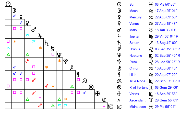 | Sun | 8 Pisces 51 | 9 Pisces 21 | 15 Taurus 53 |