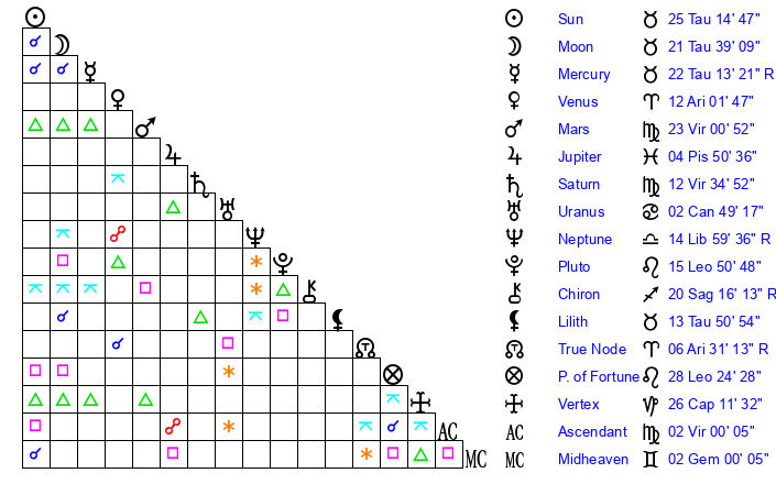 | Sun | 25 Taurus 15 | 26 Taurus 4 | 6 Leo 56 |