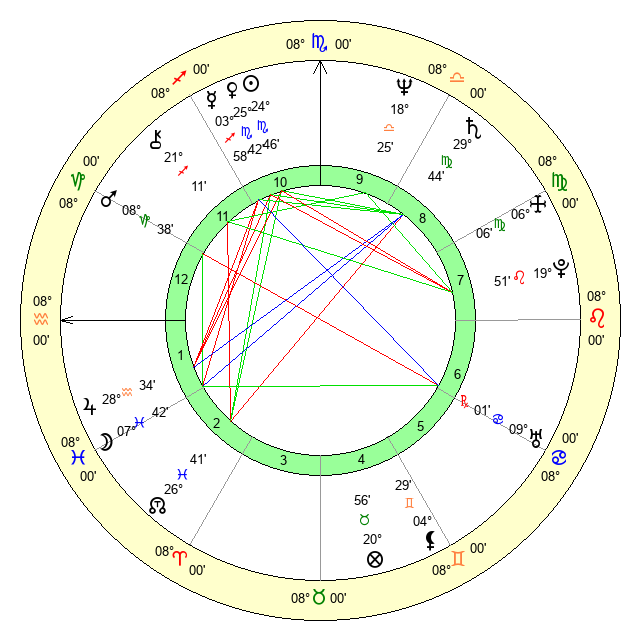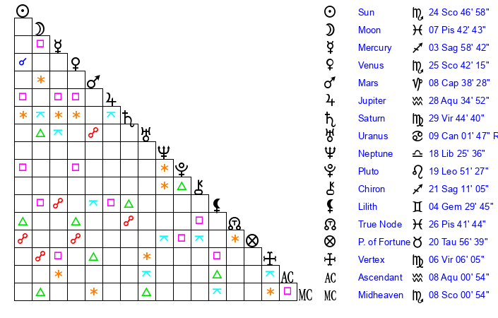 | Moon | 7 Pisces 45 | 27 Libra 34 | 25 Scorpio 10 |