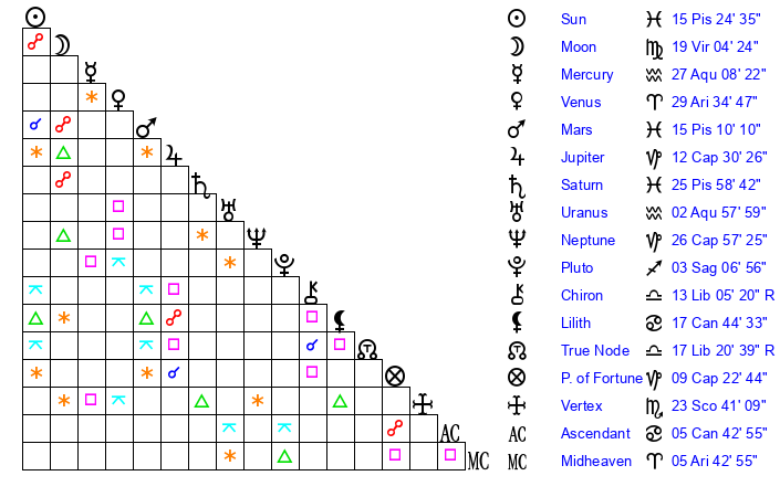 | Sun | 15 Pisces 24 | 15 Pisces 22 | 14 Aries 13 |