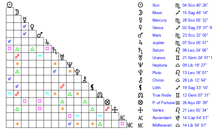 | Mercury | 28 Scorpio 6 | 29 Scorpio 13 | 19 Capricorn 51 |