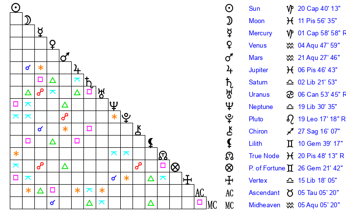 | Neptune | 19 Libra 30 | 29 Pisces 40 | 18 Libra 29 |