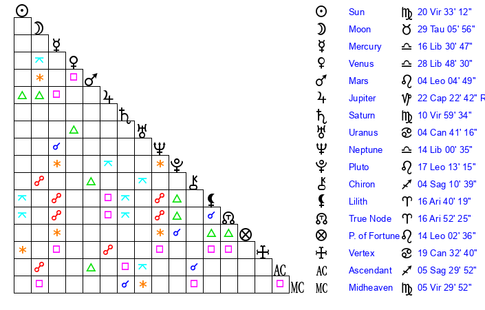 | Sun | 20 Virgo 33 | 21 Virgo 9 | 6 Sagittarius 9 |