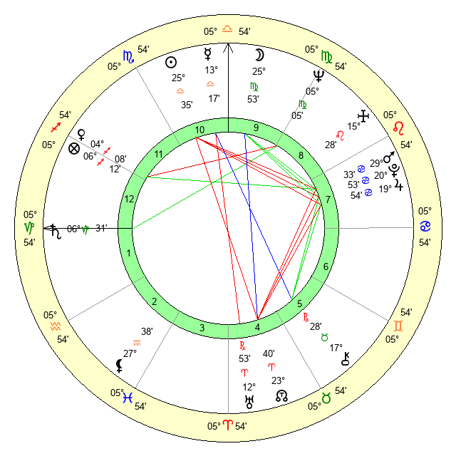 | Moon | 25 Virgo 54 | 6 Libra 28 | 14 Pisces 49 |