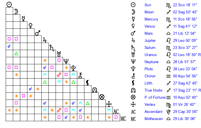 | Moon | 2 Sagittarius 48 | 0 Libra 35 | 19 Gemini 33 |