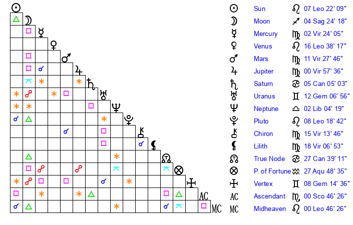 | Pluto | 8 Leo 19 | 2 Aquarius 27 | 10 Leo 9 |