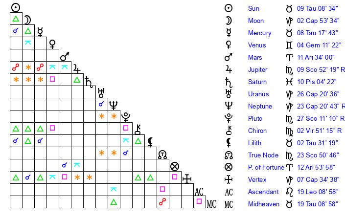 | Uranus | 26 Capricorn 22 | 26 Taurus 16 | 26 Capricorn 0 |
