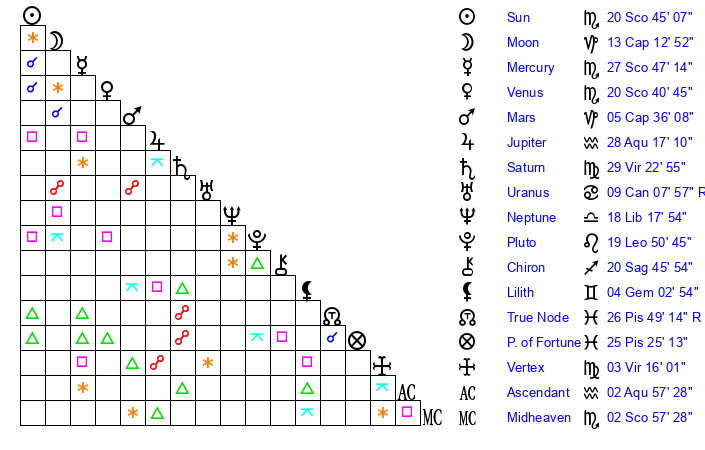 | Sun | 20 Scorpio 45 | 21 Scorpio 34 | 6 Aquarius 57 |