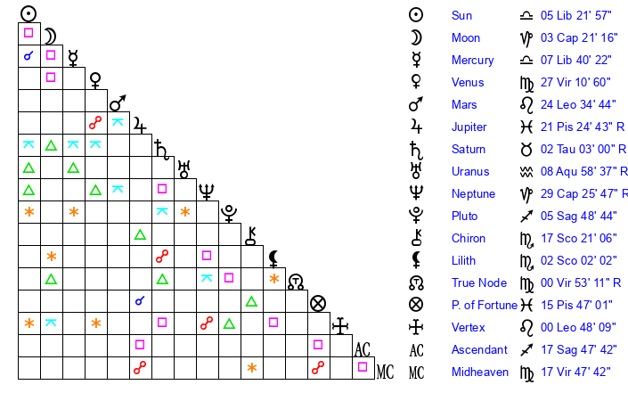 | Venus | 27 Virgo 11 | 11 Virgo 15 | 0 Scorpio 56 |