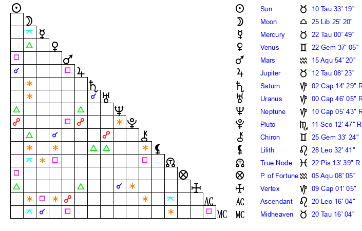 | Moon | 25 Libra 28 | 21 Gemini 21 | 8 Pisces 49 |