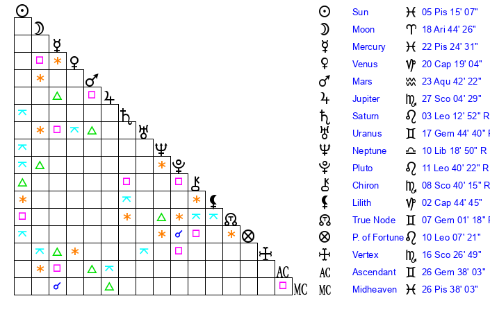 | Neptune | 10 Libra 18 | 28 Pisces 44 | 8 Libra 22 |
