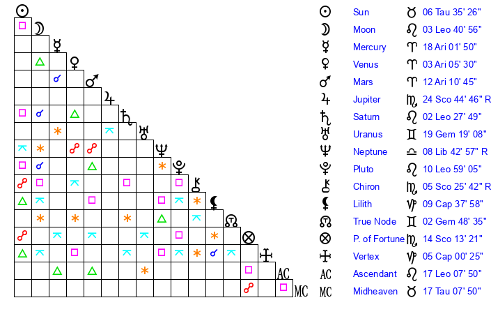 | Moon | 3 Leo 47 | 6 Taurus 15 | 2 Gemini 47 |