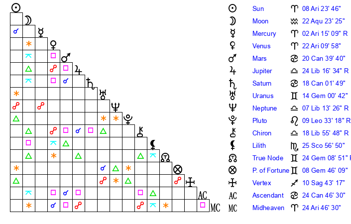 | Moon | 22 Aquarius 17 | 12 Aries 48 | 16 Capricorn 13 |