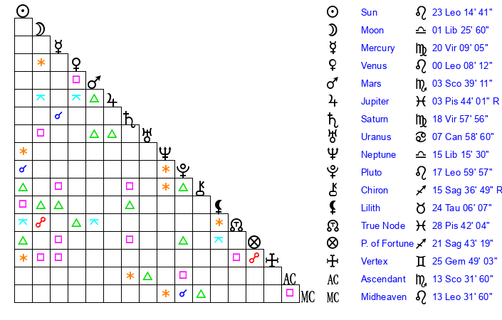 | Sun | 23 Leo 14 | 24 Leo 5 | 6 Scorpio 42 |