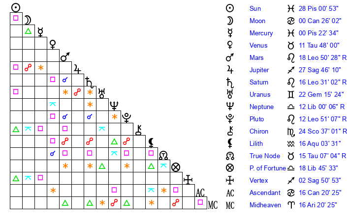 | Neptune | 11 Libra 59 | 29 Pisces 33 | 10 Libra 17 |