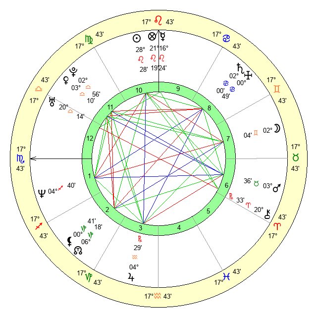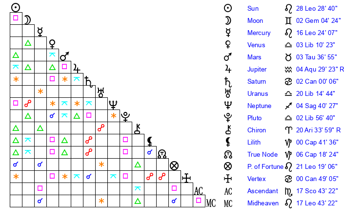 | Sun | 28 Leo 28 | 28 Leo 53 | 19 Libra 13 |