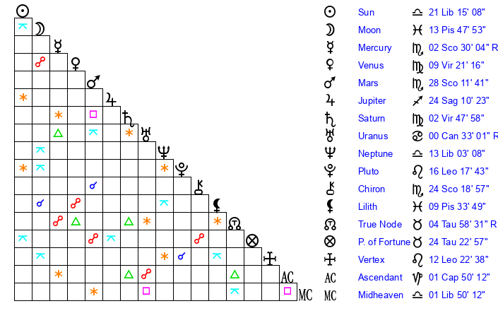 | Saturn | 3 Virgo 15 | 26 Pisces 40 | 6 Virgo 32 |
