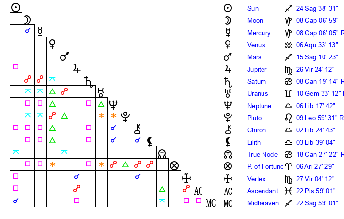 | Sun | 24 Sagittarius 39 | 24 Sagittarius 59 | 16 Pisces 46 |