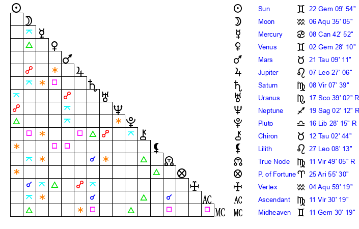 | Saturn | 8 Virgo 30 | 1 Aries 7 | 12 Virgo 28 |