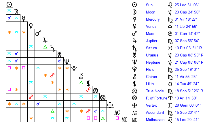 | Moon | 23 Capricorn 20 | 28 Gemini 39 | 12 Pisces 23 |