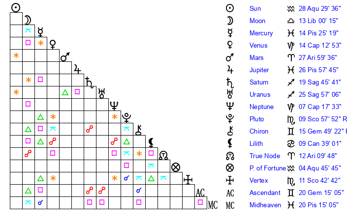 | Sun | 28 Aquarius 30 | 29 Aquarius 17 | 6 Aries 29 |