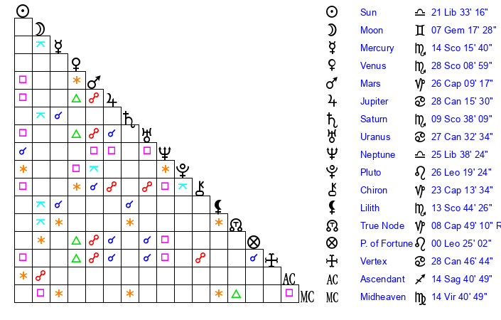| Mercury | 14 Scorpio 15 | 12 Scorpio 42 | 3 Capricorn 6 |