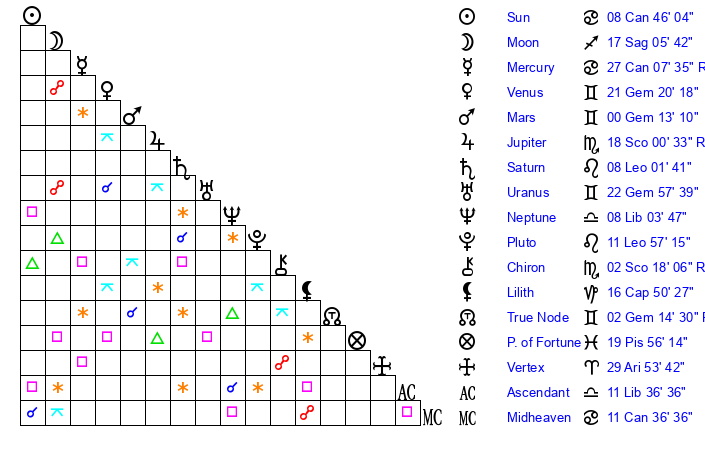 | Moon | 17 Sagittarius 1 | 24 Virgo 53 | 28 Libra 14 |