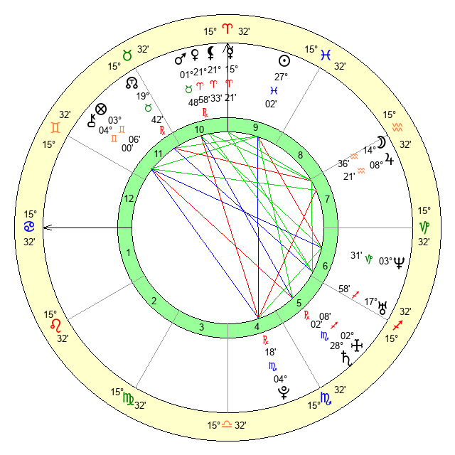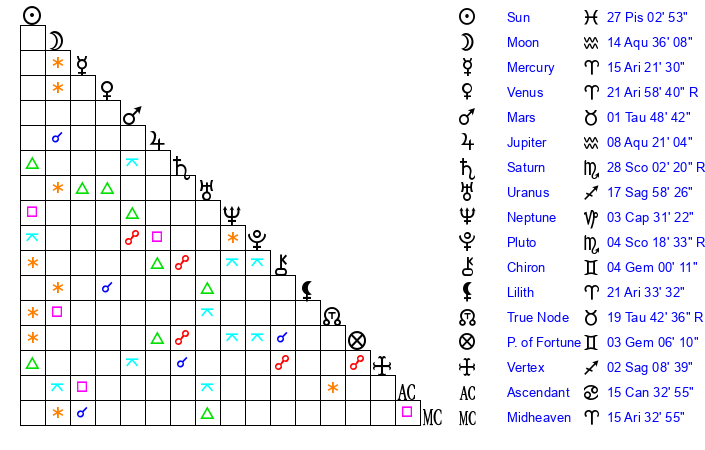 | Moon | 14 Aquarius 30 | 4 Scorpio 33 | 18 Cancer 31 |
