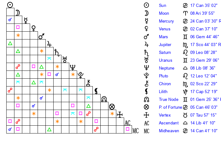 | Sun | 17 Cancer 35 | 18 Cancer 41 | 2 Libra 46 |