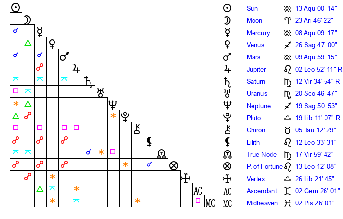| Sun | 13 Aquarius 0 | 13 Aquarius 51 | 29 Pisces 14 |