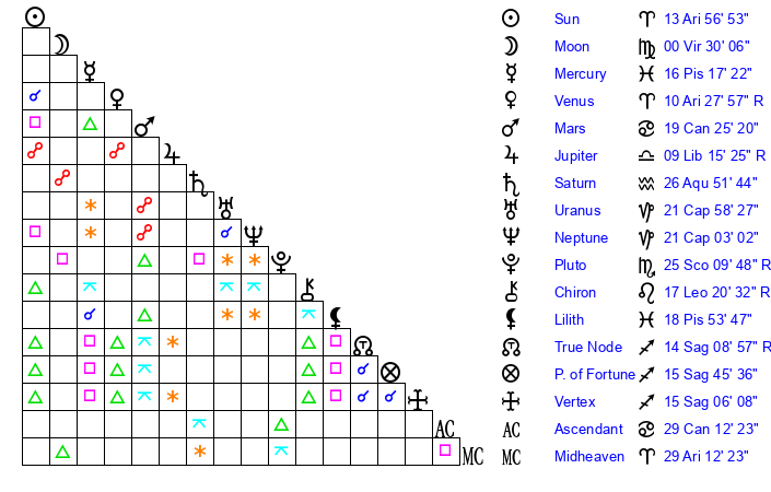 | Moon | 0 Virgo 41 | 26 Gemini 40 | 9 Scorpio 13 |