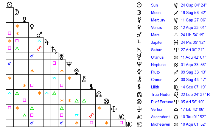 | Moon | 19 Sagittarius 56 | 4 Leo 16 | 3 Sagittarius 32 |