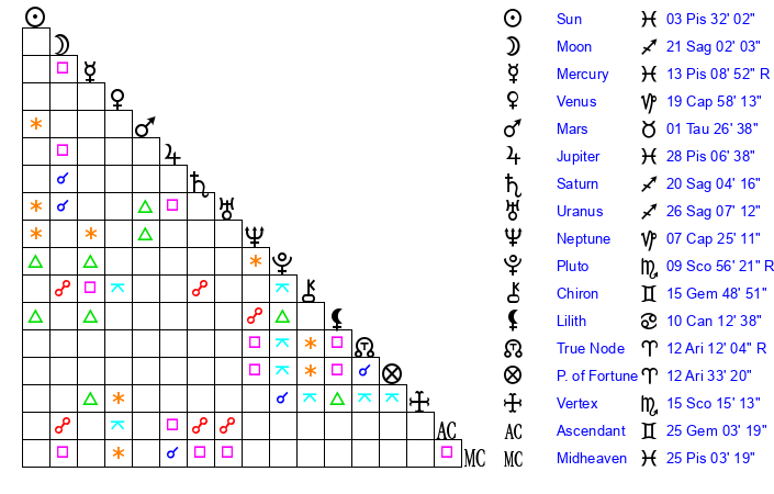 | Sun | 3 Pisces 32 | 4 Pisces 19 | 11 Aries 26 |