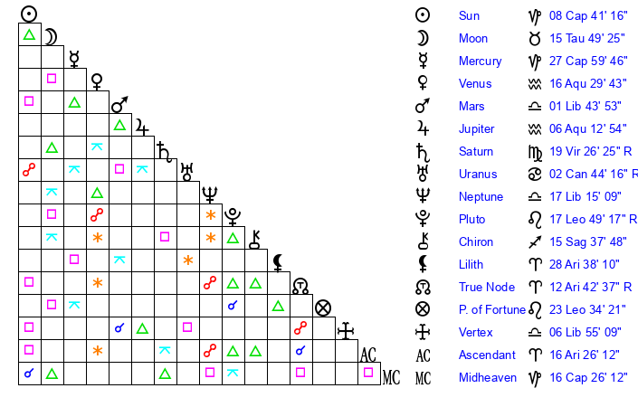 | Neptune | 17 Libra 15 | 29 Pisces 29 | 16 Libra 32 |