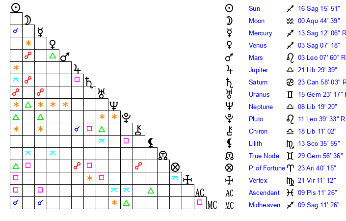 | Sun | 16 Sagittarius 16 | 16 Sagittarius 51 | 7 Pisces 30 |