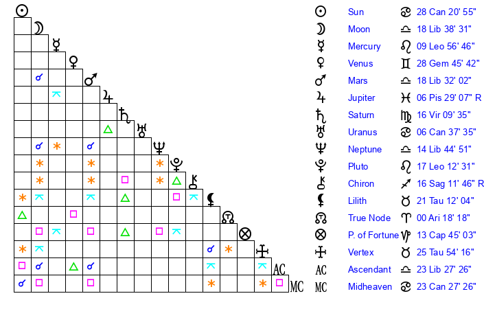 | Moon | 18 Libra 39 | 18 Gemini 17 | 15 Cancer 5 |