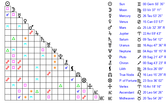 Sun | 0 Gemini 55 | 1 Gemini 37 | 25 Gemini 50 |