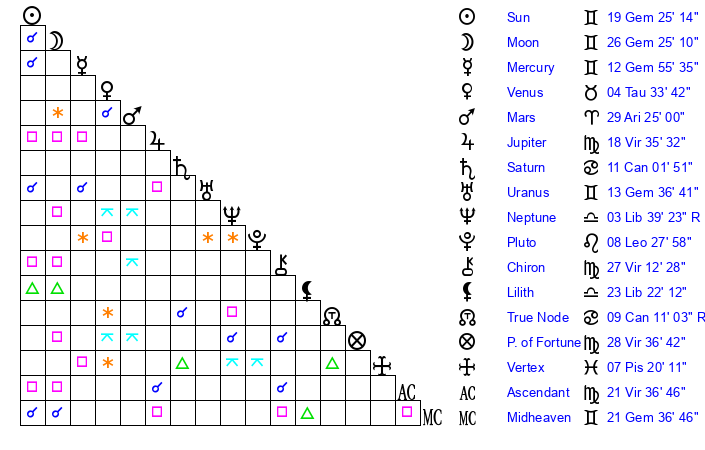 | Sun | 19 Gemini 26 | 20 Gemini 4 | 5 Virgo 58 |