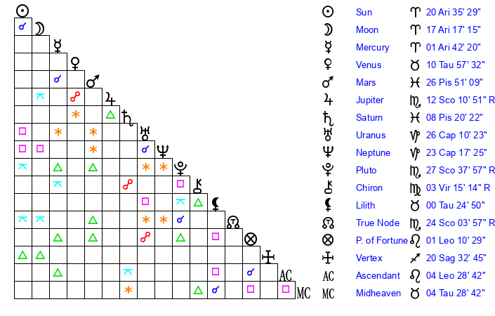 | Sun | 20 Aries 35 | 21 Aries 4 | 20 Taurus 46 |