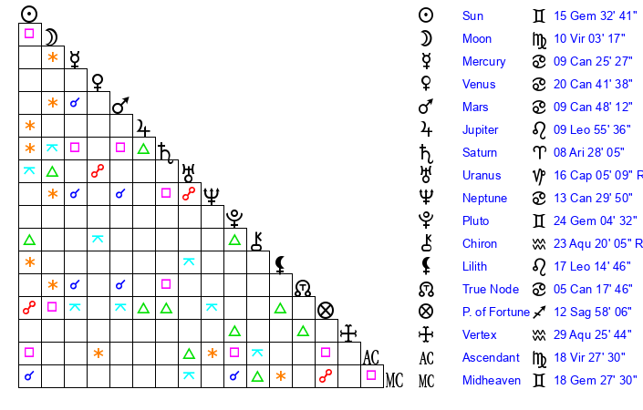 | Sun | 15 Gemini 33 | 16 Gemini 14 | 8 Libra 6 |