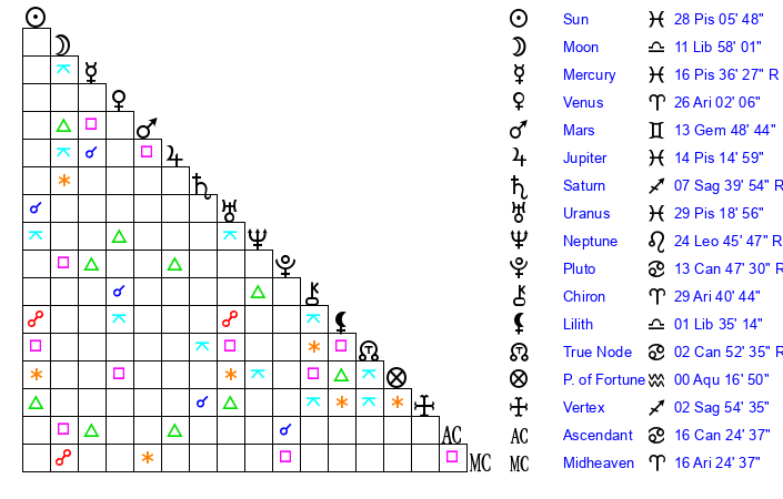| Moon | 11 Libra 57 | 28 Scorpio 12 | 16 Taurus 39 |