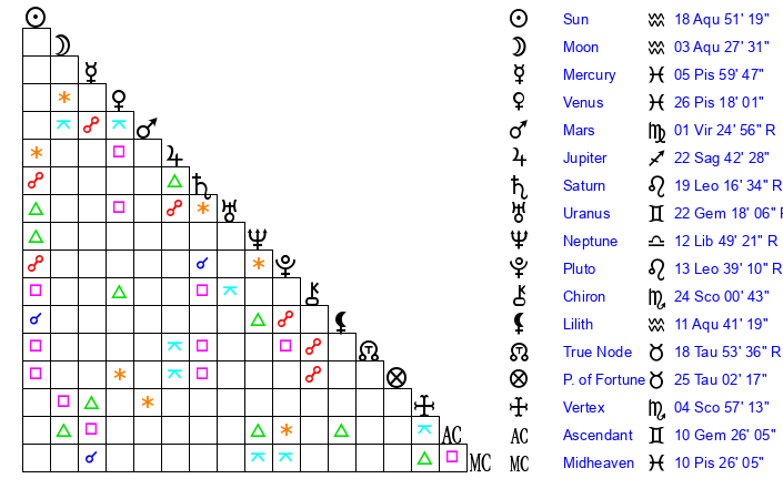| Sun | 18 Aquarius 51 | 20 Aquarius 11 | 5 Taurus 23 |