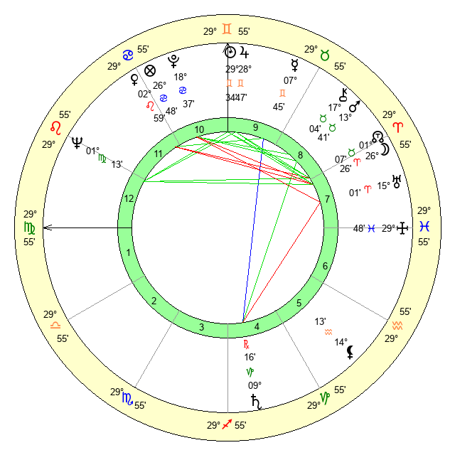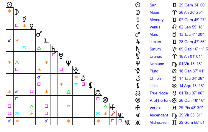 | Sun | 29 Gemini 34 | 0 Cancer 34 | 0 Libra 55 |