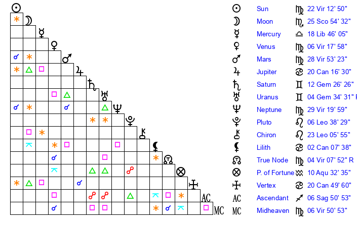 | Sun | 22 Virgo 12 | 23 Virgo 6 | 14 Sagittarius 58 |