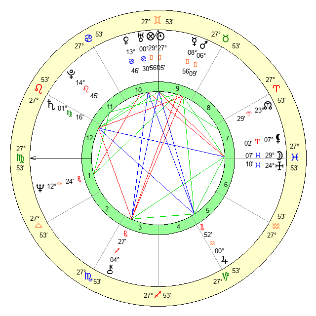 | Sun | 27 Gemini 6 | 27 Gemini 42 | 9 Virgo 52 |